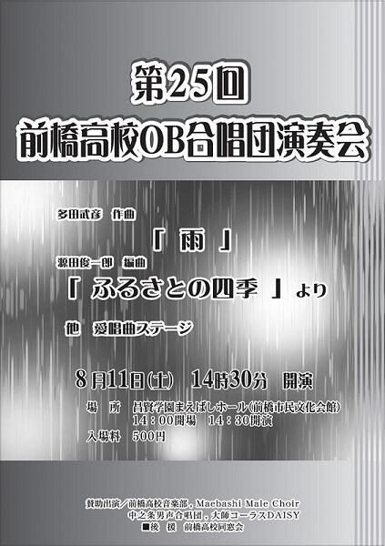 8月11日(土)に昌賢学園まえばしホール(前橋市民文化会館)小ホールにて,第25回OB合唱団演奏会が開催(14:00開場 14:30開演 入場料500円)されます。