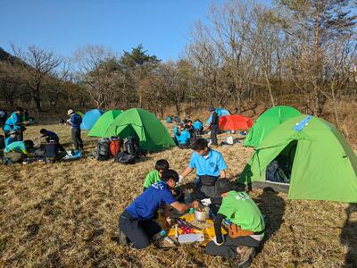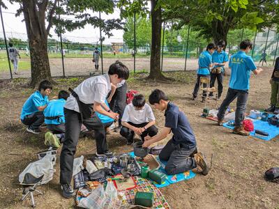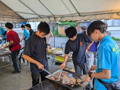 ↑野反湖キャンプ場にて幕営。炊事の様子です。各班毎に違うメニューを考え、牛丼、ロコモコ、もつ煮、チーズダッカルビ等を作りました。