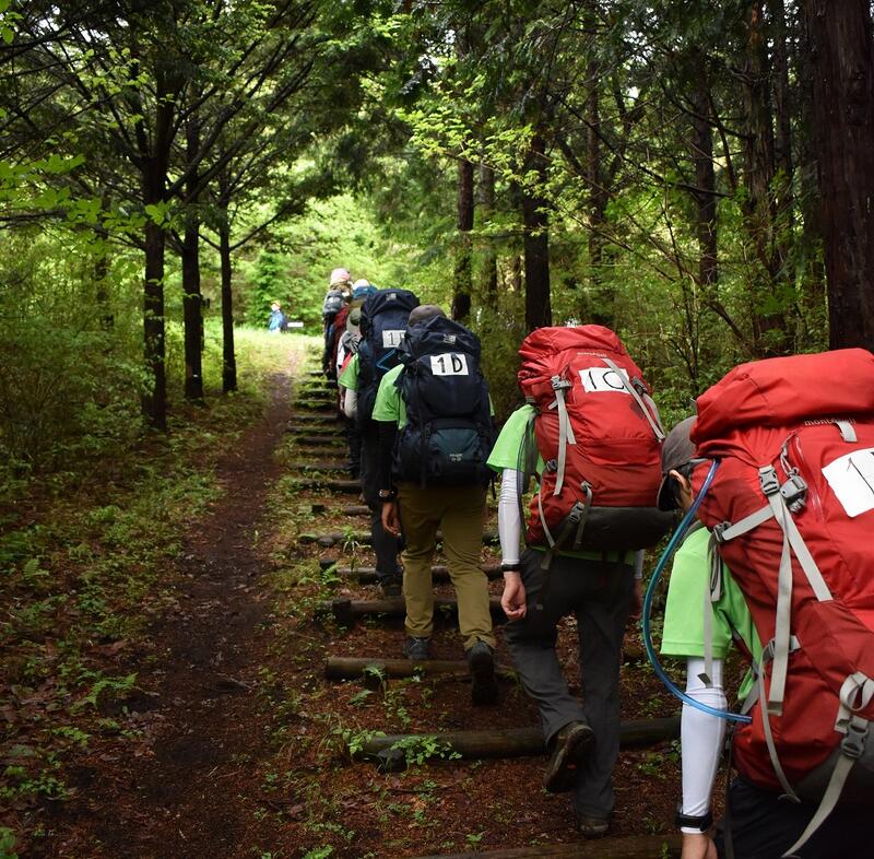 競技は水平距離3km、標高差530mのコースを8kgの荷物を背負って駆け上がり、所要時間により競います。