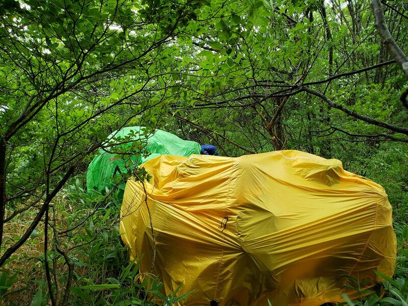 ↑通り雨をツエルト、フライを被ってやり過ごす部員達
